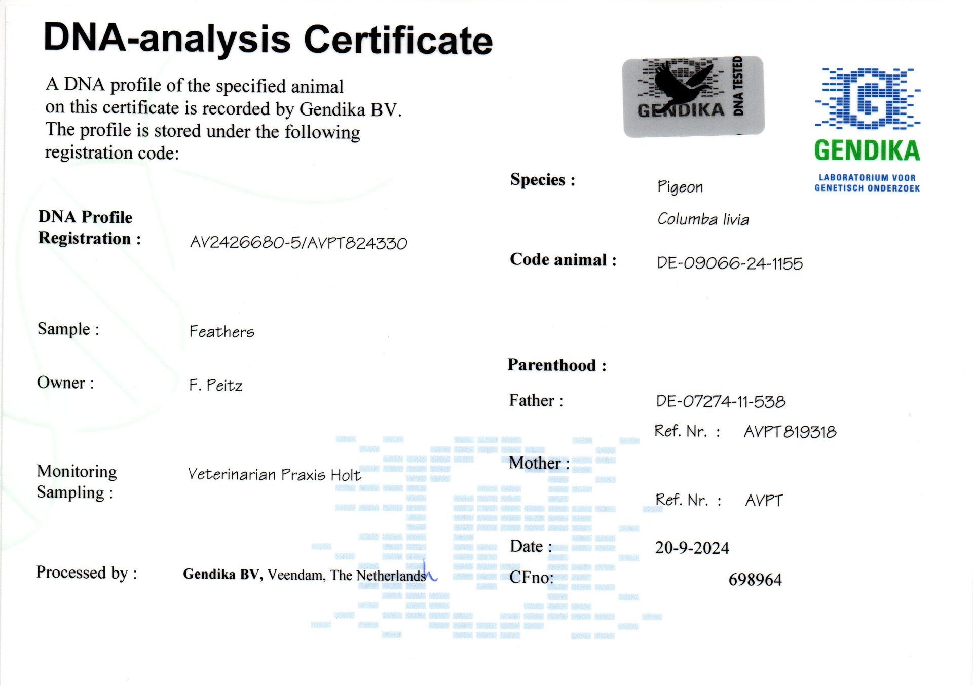 2014: Black ChampDV 02910-14-341, 9.Place in Final, 2453 birds, 12500 Dollars